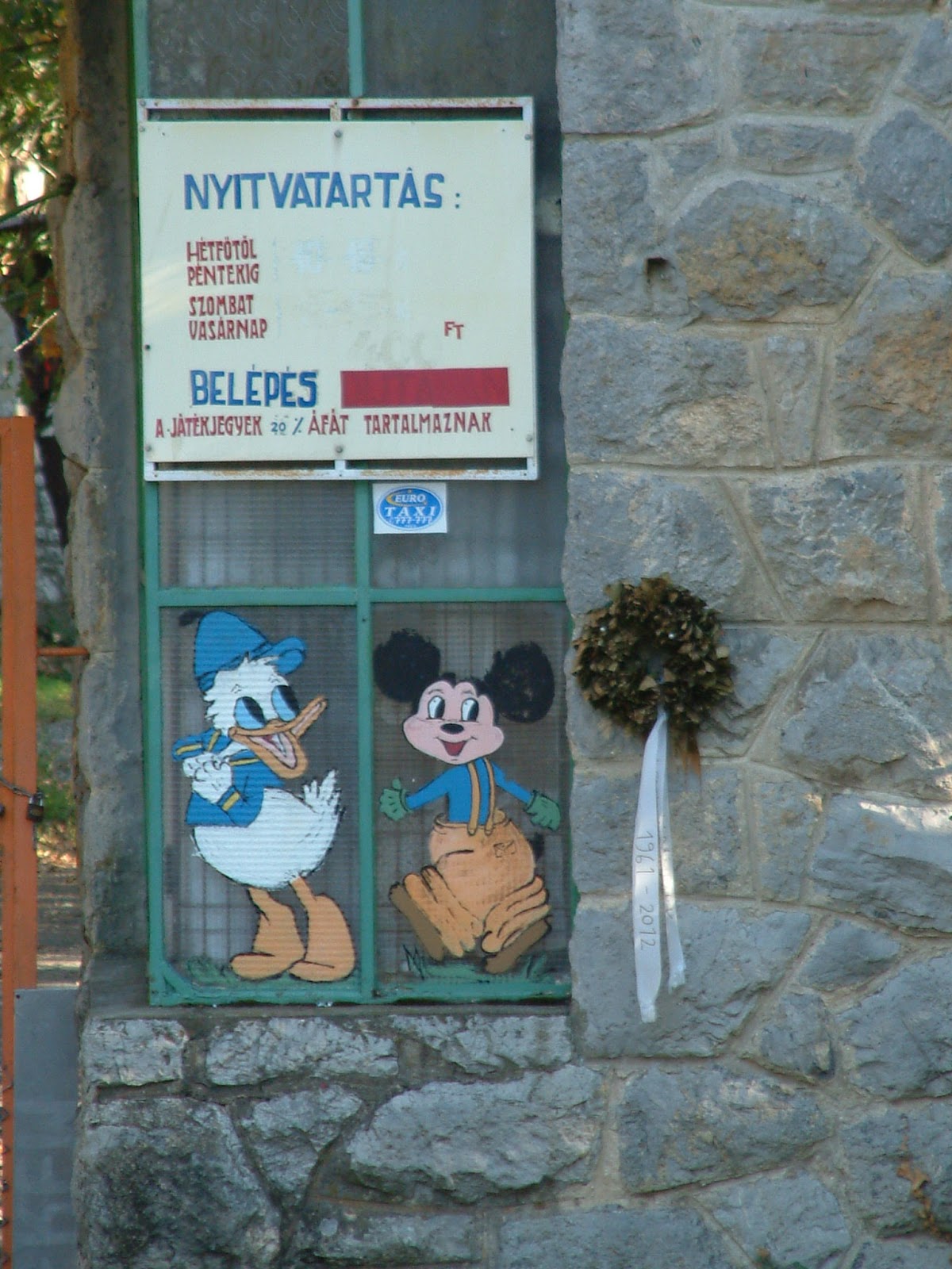 Bent kapható perec, zsíroskenyér, műanyag poharas kávé, és meggy márka. Mindegyikből vettünk egyet, és leültünk vele a fák alá. A kilátás bizarr. Az egyik oldalon a színpompás őszi erdő, a másikon kopott vaskerítés, továbblépve pedig a világ legszomorúbb vidámparkja, Mickey egérrel, Donald kacsával és egy temetési koszorúval a kasszánál. A vidámparkot négy évtized után nemrég végleg bezárták.